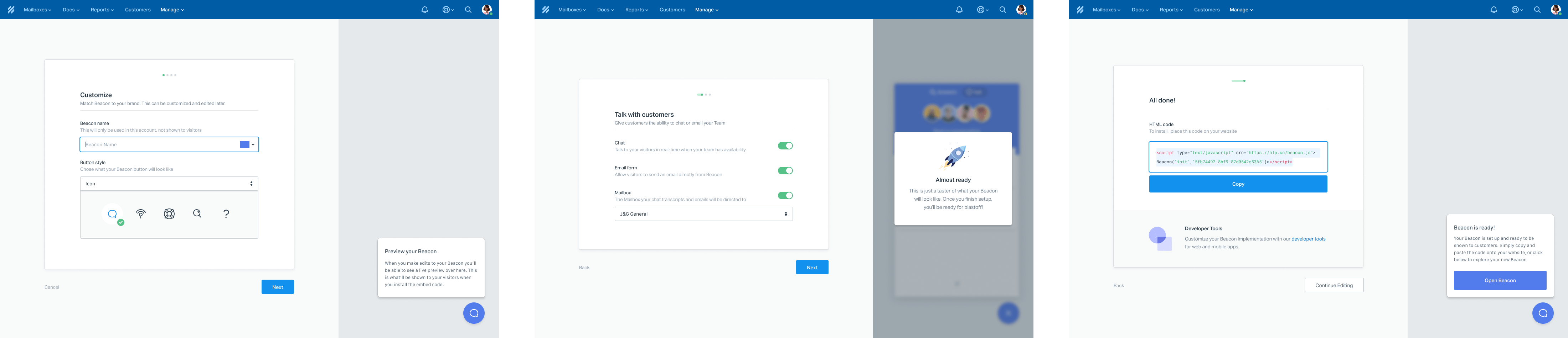 Whilst complex and powerful in nature, I didn’t want Beacon or the Chat Admin to feel overwhelmingly complicated or technical to create — so close attention was paid to designing an onboarding flow that felt lightweight, yet powerful. Ultimately Beacon isn’t much use if no-one is creating them!